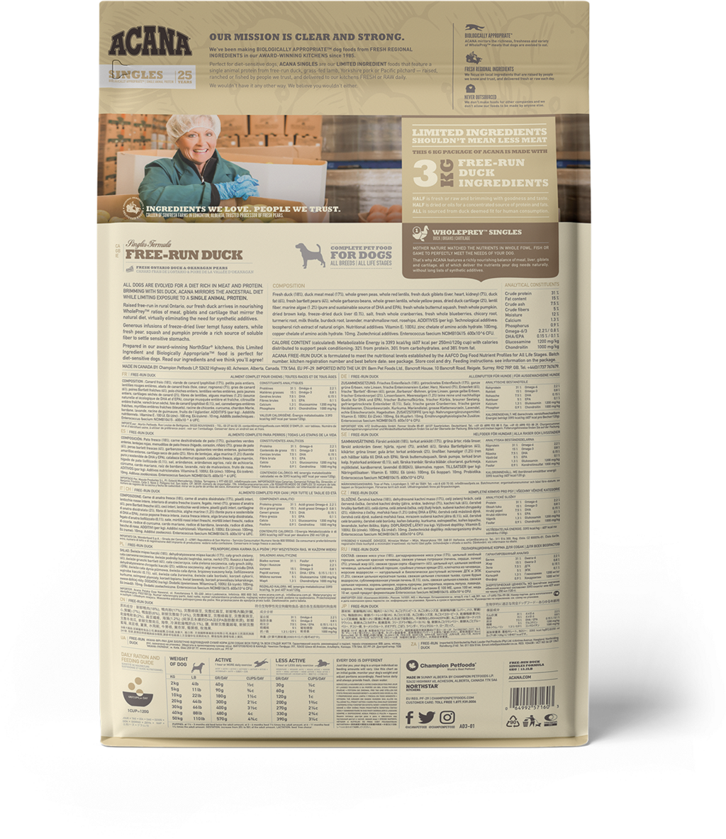 Meno ingredienti non significa meno qualità! Free-Run Duck di ACANA™ è sinonimo di dieta naturale, ricca di proteine e sana. Ideale per cani con sensibilità alimentari o semplicemente come spuntino speciale nella ciotola.