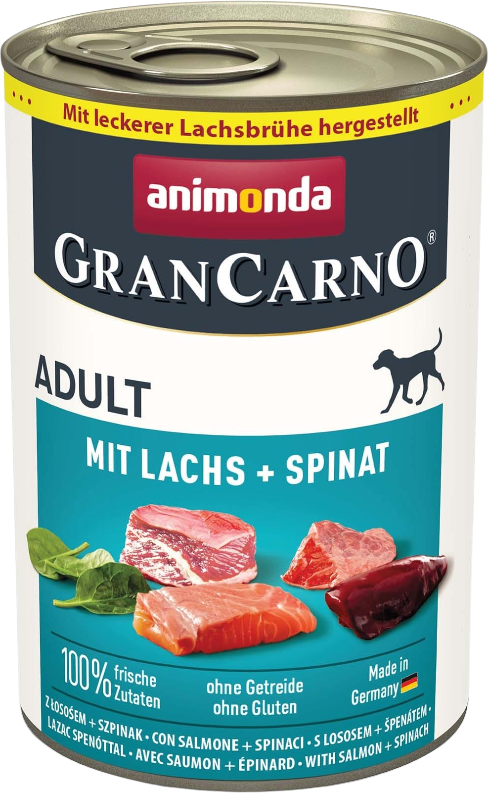 GranCarno Adult - Lattina con Salmone + Spinaci è composto al 100% da ingredienti freschi. Contiene carne di maiale, salmone, spinaci e olio di cartamo. La ricetta è priva di cereali e glutine ed è ideale per cani di età compresa tra 1 e 6 anni.