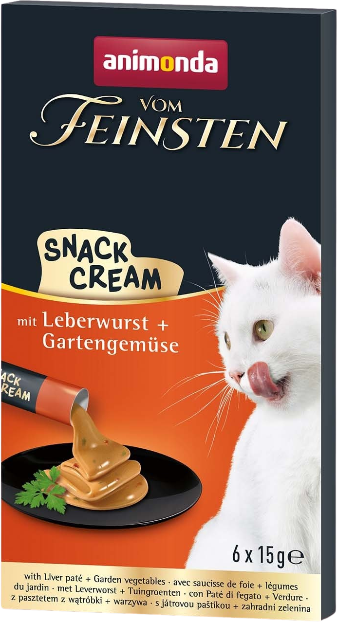 La crema Vom Feinsten Adult è al sapore di salsiccia di fegato e aggiunge una nota aromatica speciale con deliziose verdure. La confezione contiene sei bustine da offrire tra un pasto e l'altro.