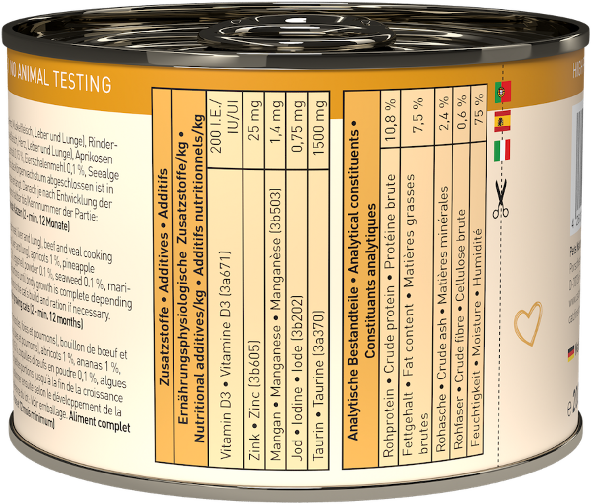 50 % manzo (cuore, muscolo, fegato, polmone), 26,4 % brodo di manzo e vitello, 20 % vitello (muscolo, cuore, fegato, polmone), 1 % albicocca, 1 % ananas, 1 % minerali, 0,15 % olio di lino, 0,15 % olio di salmone, 0,1 % farina di guscio d'uovo, 0,1 % alghe, 0,1 % calendula