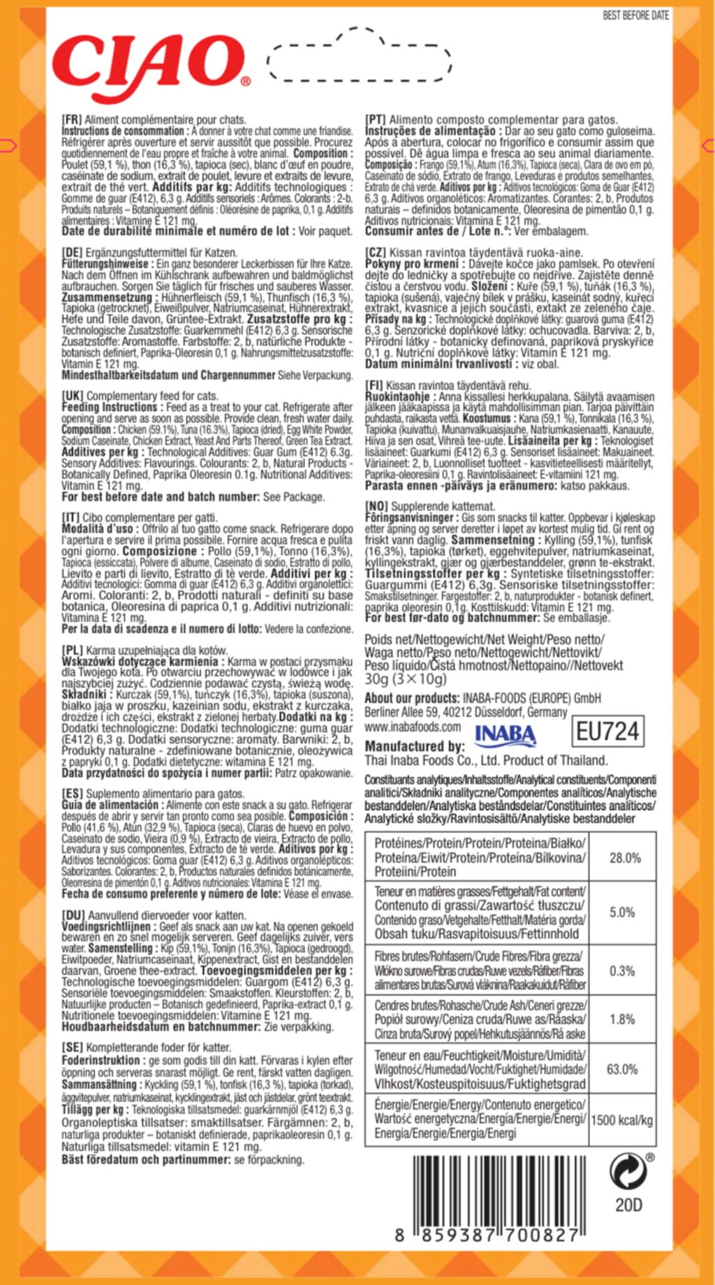 59,1 % carne di pollo, 16,3 % tonno, tapioca essiccata, proteine in polvere, caseinato di sodio, estratto di carne di pollo, lievito, estratto di tè verde