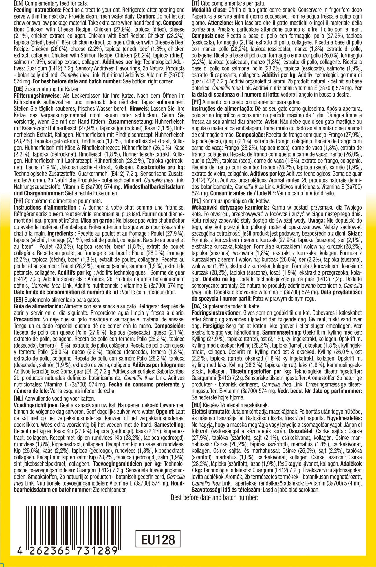 Che delizia! Questo irresistibile snack da leccare farà battere forte il cuore anche dei felini più esigenti. Ingredienti selezionati e una ricetta adatta alla specie lo rendono uno snack davvero speciale con cui potrai viziare il tuo gatto più e più volte.