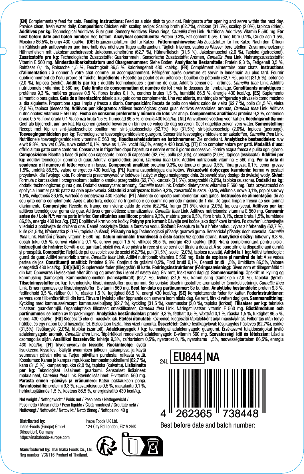 62,5 % brodo di capesante, 31,4 % carne di pollo, 2 % capesante, gomma di guar, agar