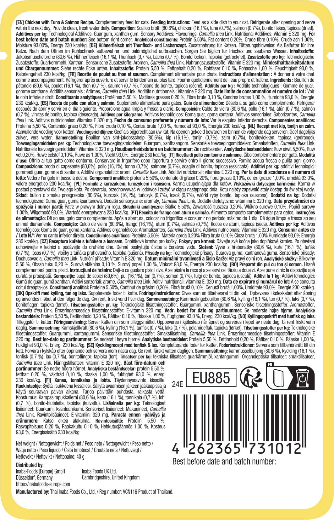 80,6 % brodo di capesante, 16,1 % carne di pollo, 0,7 % tonno, 0,7 % salmone, fiocchi di bonito, tapioca essiccata, gomma di guar, gomma xantana, aromi