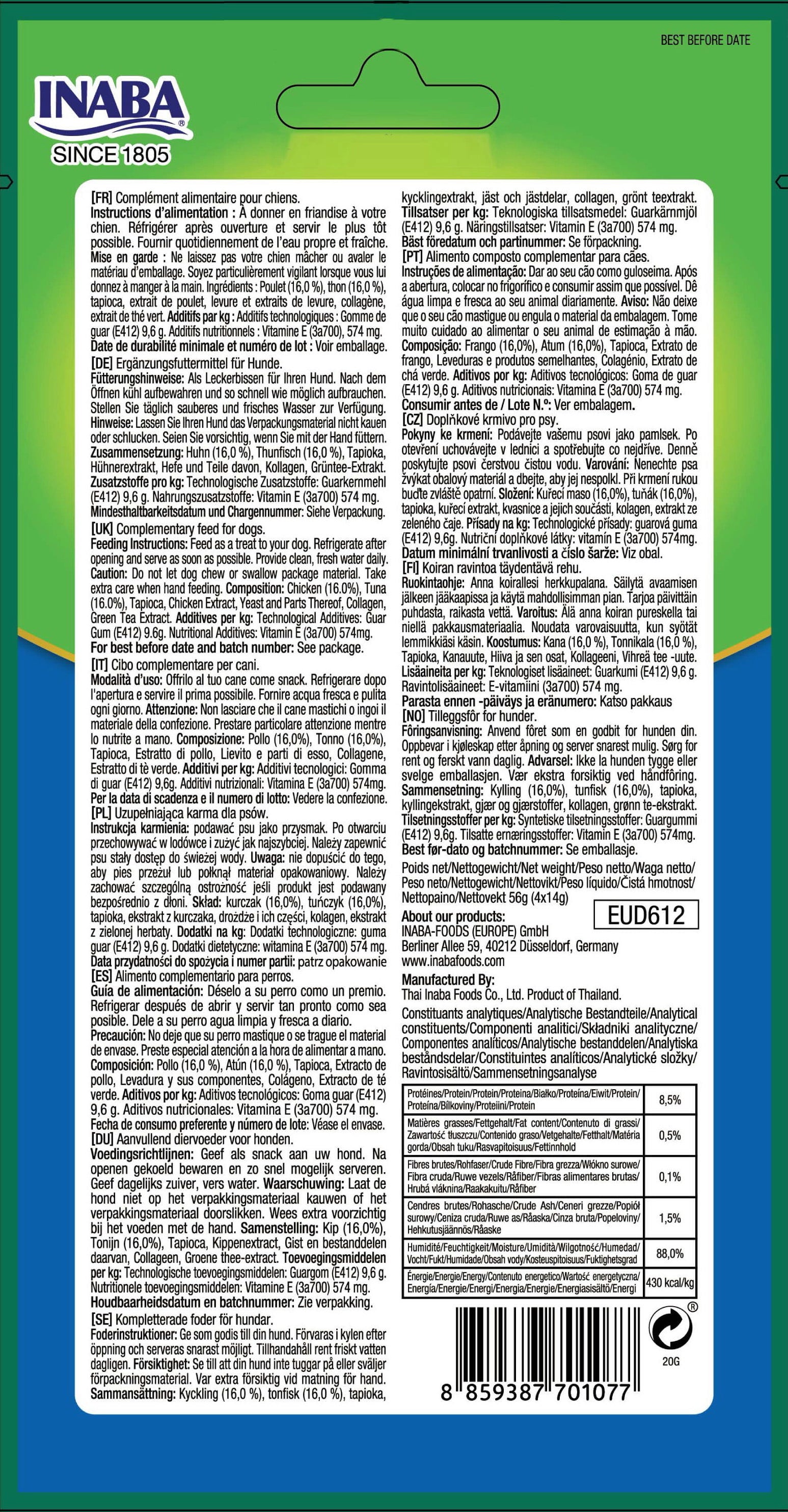 16 % pollo, 16 % tonno, tapioca, estratto di carne di pollo, lievito, collagene, estratto di tè verde, gomma di guar