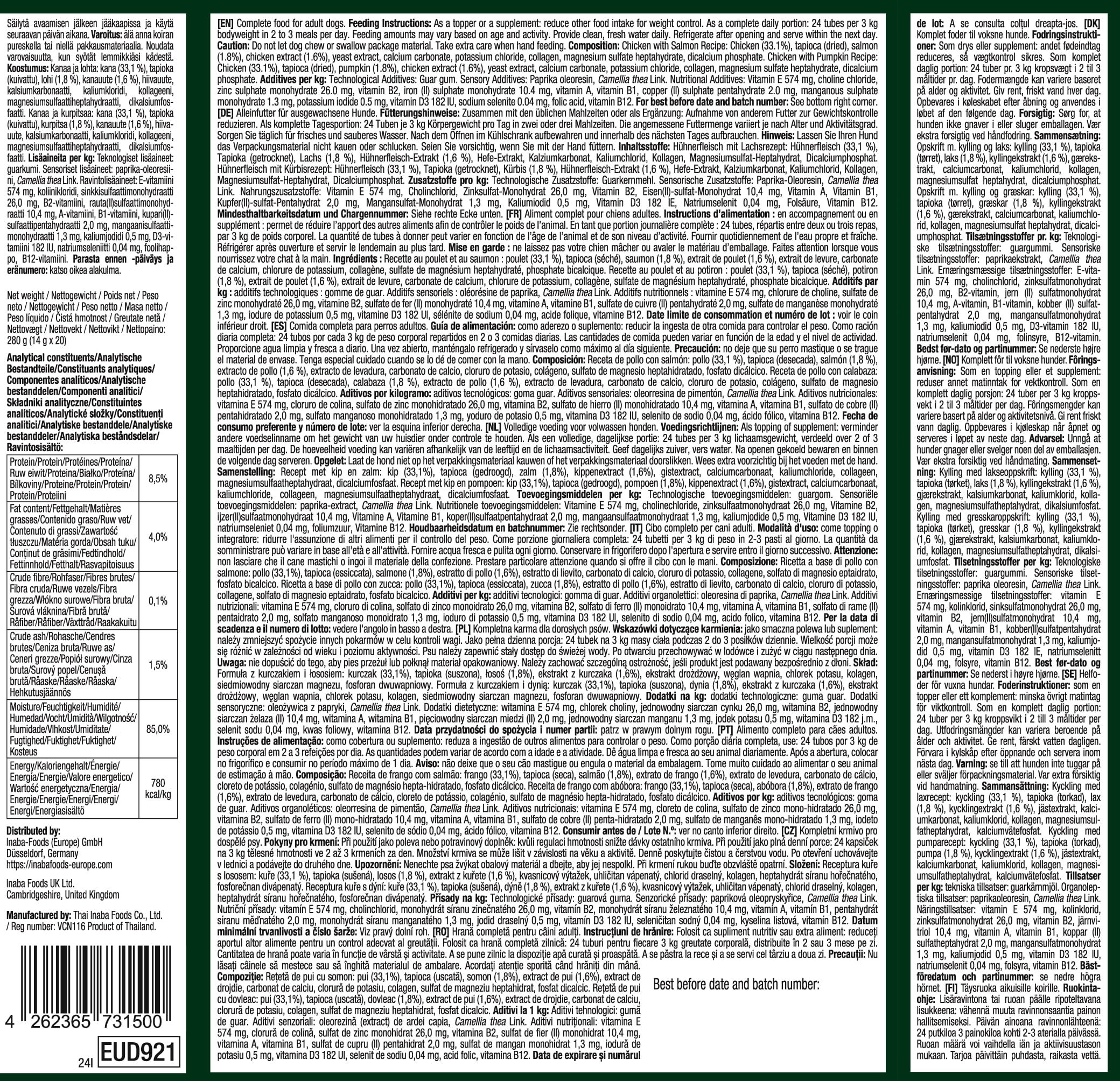 33,1 % carne di pollo, tapioca essiccata, 1,8 % salmone, 1,6 % carne di pollo, estratto di lievito, carbonato di calcio, cloruro di potassio, collagene, solfato di magnesio eptaidrato, fosfato bicalcico