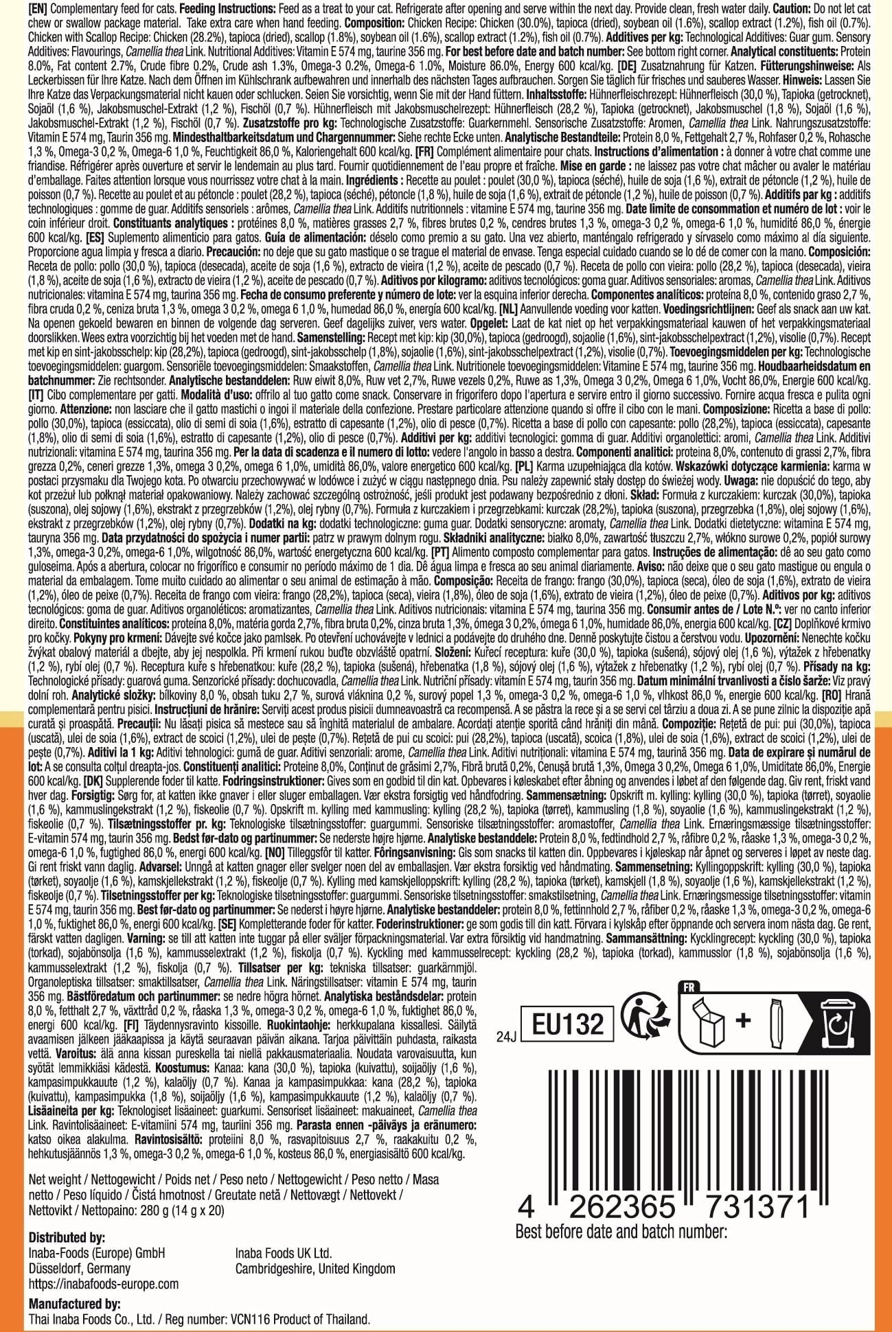 Churu Snack Cremoso Skin & Coat per Gatti 20x14 g, Varietà di pollo (280 g)