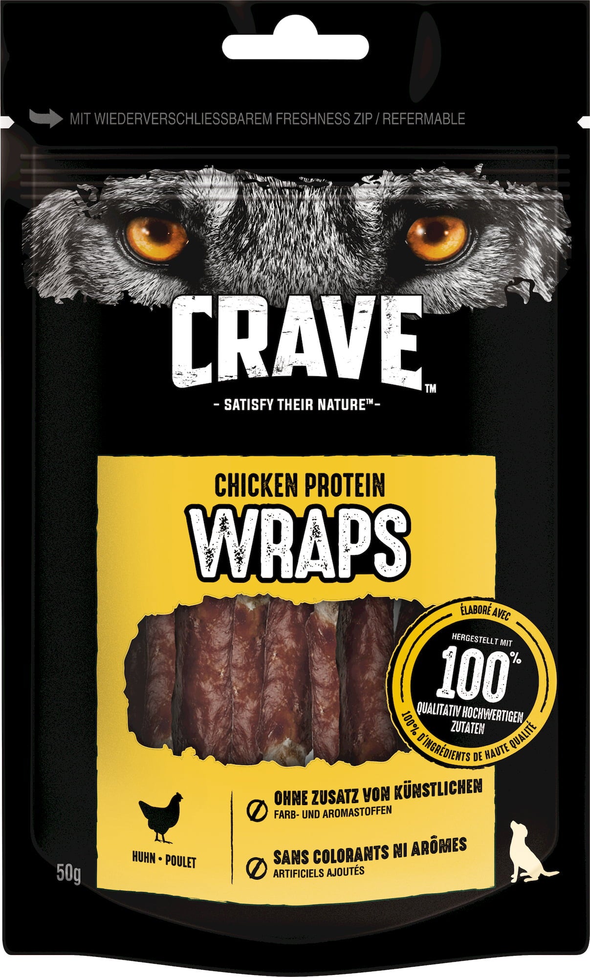Vizia il tuo animale con gli irresistibili Snack Wrap con Pollo di Crave Dog! Questi snack per cani sono realizzati con filetto di pollo 100% naturale e offrono un alto contenuto proteico. Grazie alla loro ricetta senza cereali, che rinuncia deliberatamente a coloranti e aromi artificiali, questi snack sono adatti anche ai cani più sensibili.