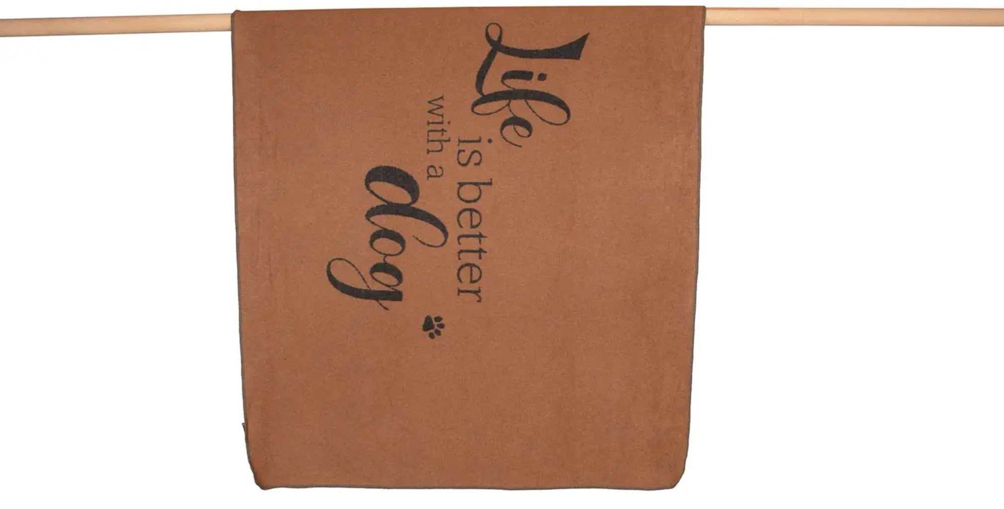 La morbida coperta per animali domestici in tessuto di alta qualità reca la scritta "Life is better with a dog" (= La vita è migliore con un cane). Grazie alla struttura resistente, la coperta può essere facilmente lavata a 40 °C con ciclo delicato e asciugata in asciugatrice, se necessario. Perfetta come accogliente coperta aggiuntiva per il posto preferito del tuo amico a quattro zampe.