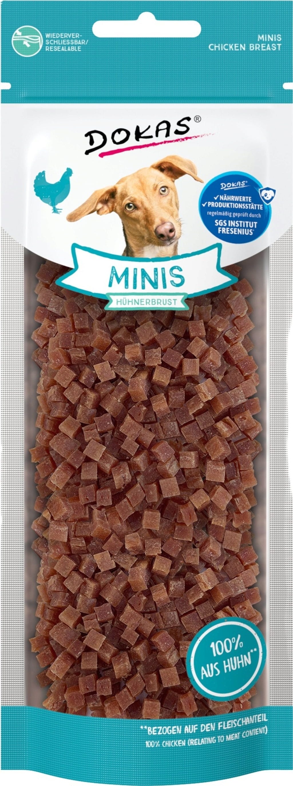 I Mini di Dokas realizzati al 100% con filetto di petto di pollo*. Grazie alle loro dimensioni compatte, sono ottimi come ricompensa durante l'addestramento. Non solo: grazie alla pratica confezione i mini possono anche essere rapidamente riposti e portati con te quando sei in viaggio. Infine, il prodotto contiene preziosa L-carnitina.
