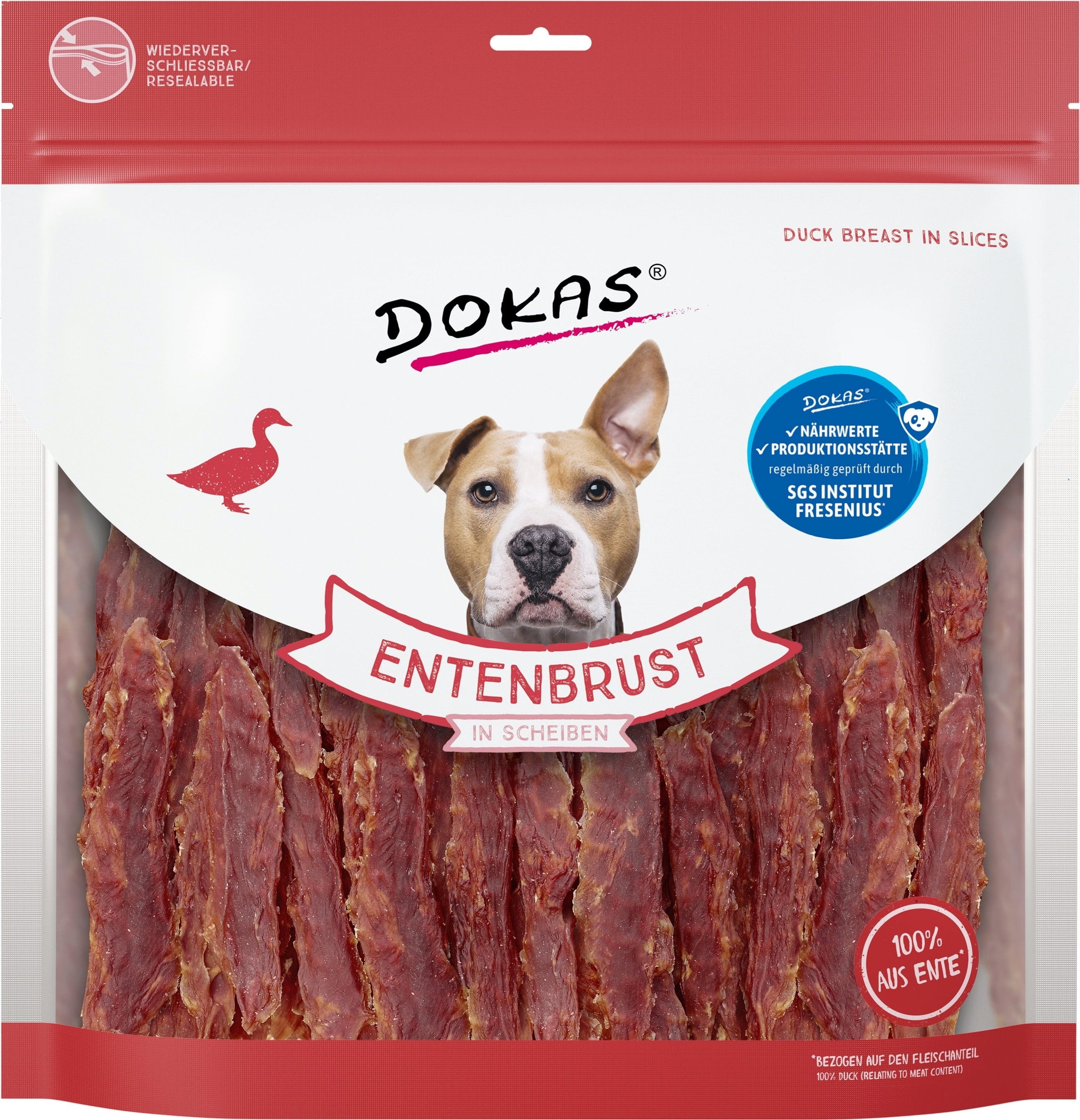 Petto d'Anatra a Fette di Dokas: un prodotto a cui nessun cane può resistere! I pezzi sono realizzati al 100% con filetto di petto d'anatra* di alta qualità, delicatamente essiccato all'aria. Ideale da dare tra un pasto e l'altro.