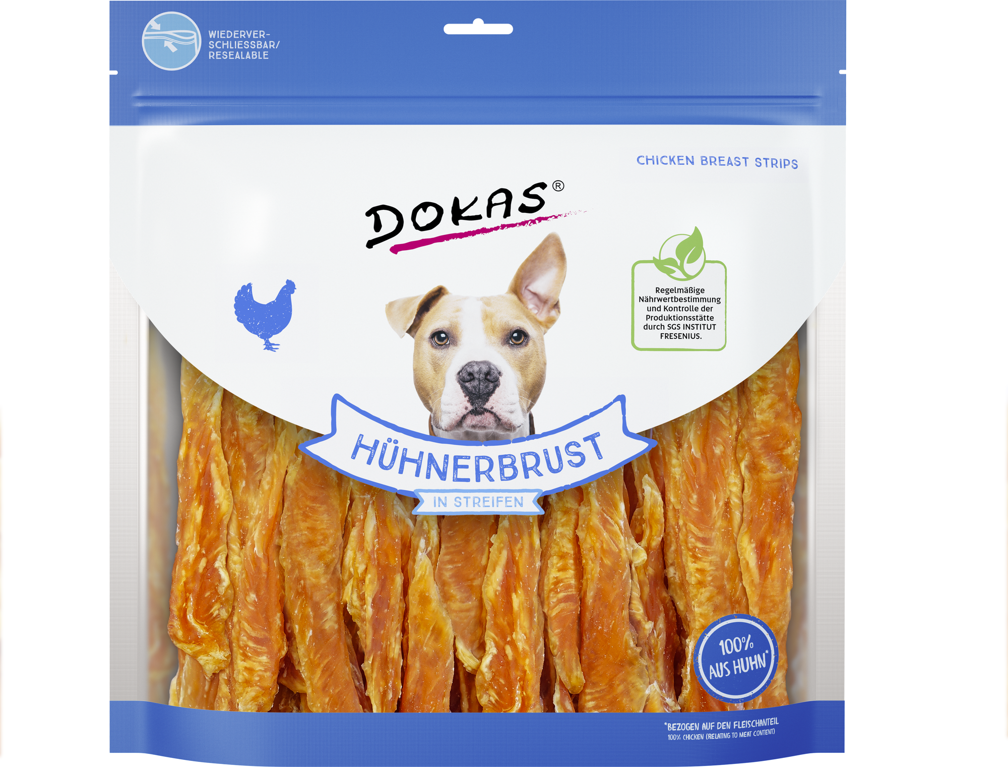 Le listarelle di carne di Dokas vengono essiccate delicatamente all'aria e sono particolarmente povere di grassi. Sono realizzate al 100% con filetto di petto di pollo* di alta qualità e sono uno spuntino meraviglioso tra un pasto e l'altro.