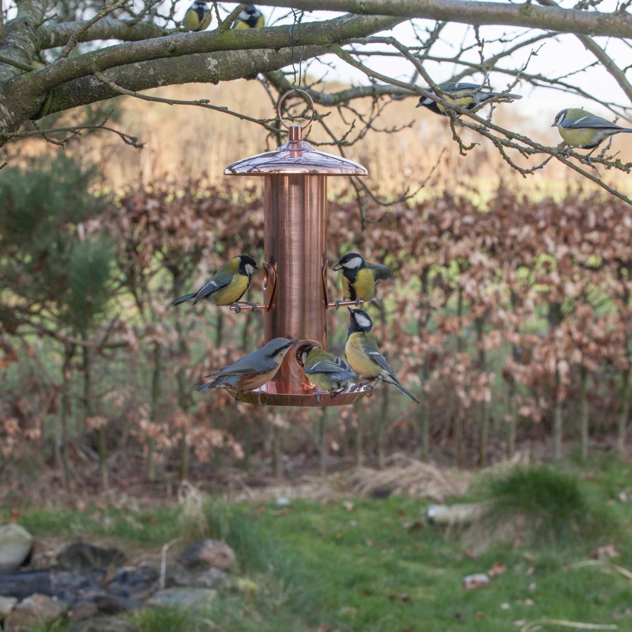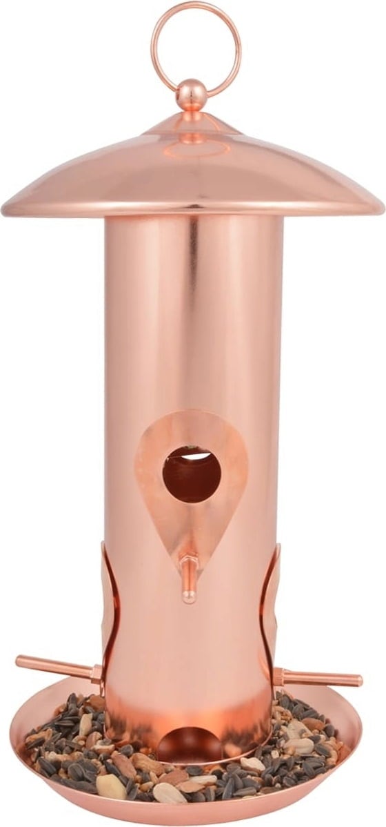 Questa meravigliosa mangiatoia non è solo un bell'accessorio per il tuo giardino, ma un punto di ristoro per i tuoi amici volatili. Il mangime esce ben dosato grazie alle sei aperture e rimane nella ciotola inferiore in modo che gli uccellini possano nutrirsi secondo necessità. Un sistema ben congegnato dal design elegante!