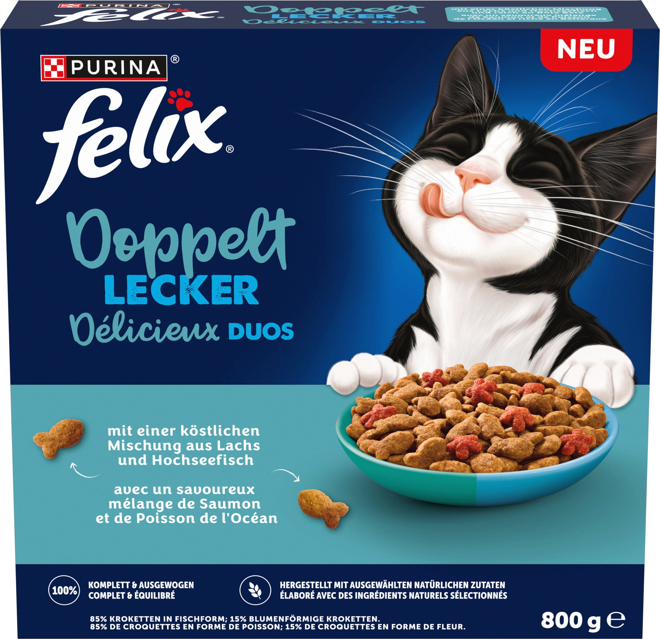 - corrisponde al 4% di pesce e sottoprodotti del pesce, con almeno il 4% di salmone nelle crocchette a forma di pesce, corrispondente al 3% di salmone nel prodotto.