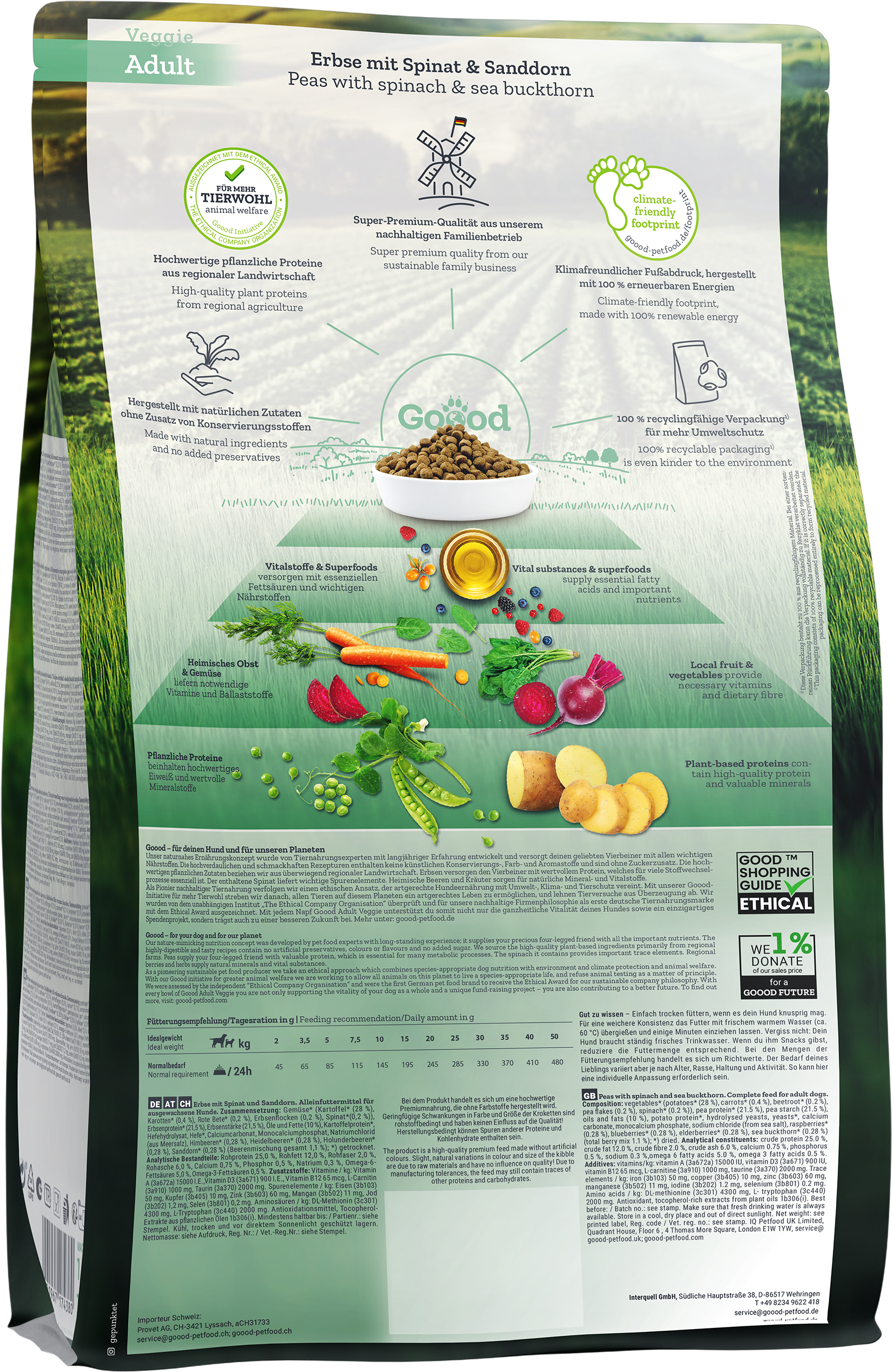 Con questo cibo per cani il tuo amato animale domestico si gusta un pasto delizioso e adatto alla sua specie, completamente privo di carne, a base di piselli, spinaci, olivello spinoso, frutti di bosco ed erbe aromatiche provenienti da aziende agricole locali. Un concentrato di energia naturale che fornisce al tuo cane tutti i nutrienti essenziali in modo gustoso e appropriato alla sua specie. Un menu davvero salutare, con ingredienti di provenienza etica e incredibilmente delizioso!