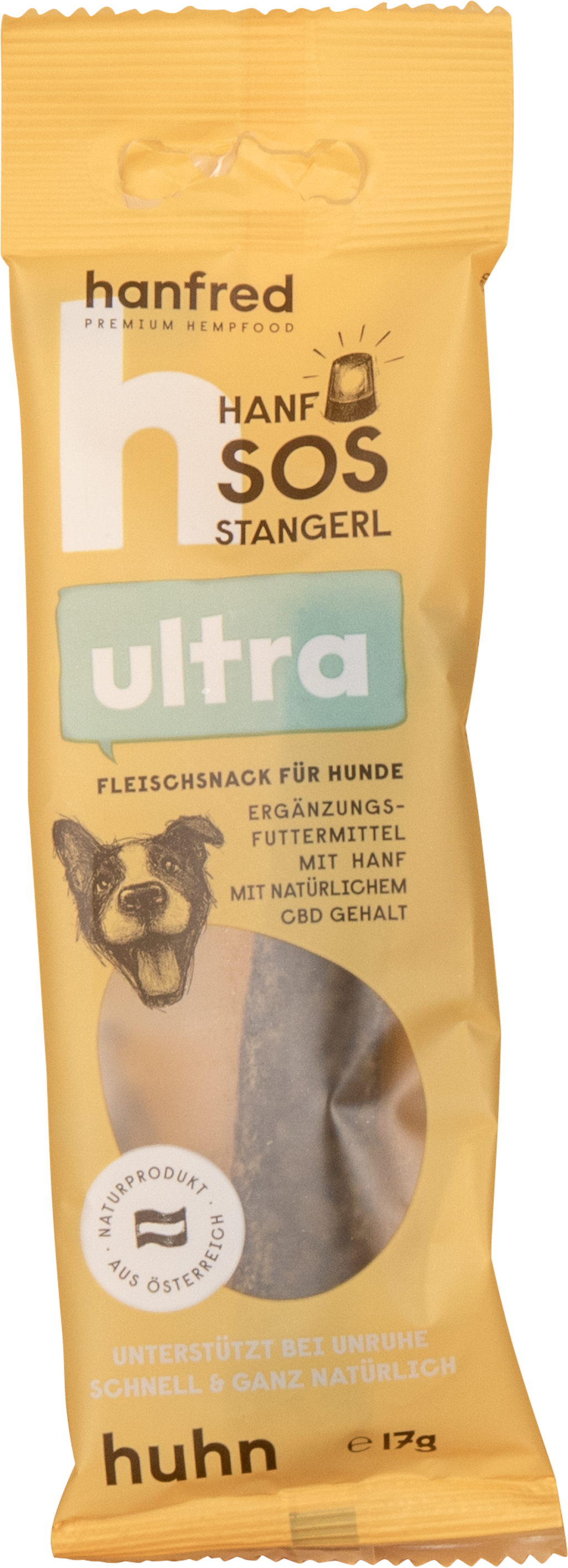 I bastoncini SOS Ultra contengono il 25% di canapa e sono pensati come alimento complementare per il cane, particolarmente indicati in viaggio o in situazioni insolite. Realizzati con carne succosa e polvere di canapa, senza aggiunte superflue.