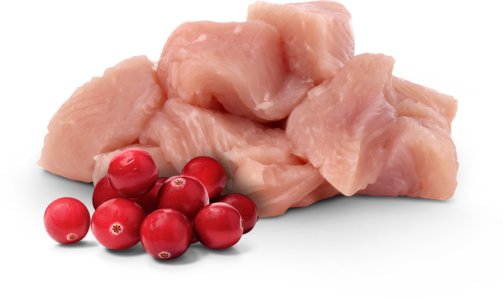 88 % carne e sottoprodotti di origine animale (40,6 % tacchino), minerali, 1 % olio di salmone, amido di piselli, proteine del pisello, 0,4 % inulina di cicoria, lignocellulosa, 0,1 % cranberry essiccati