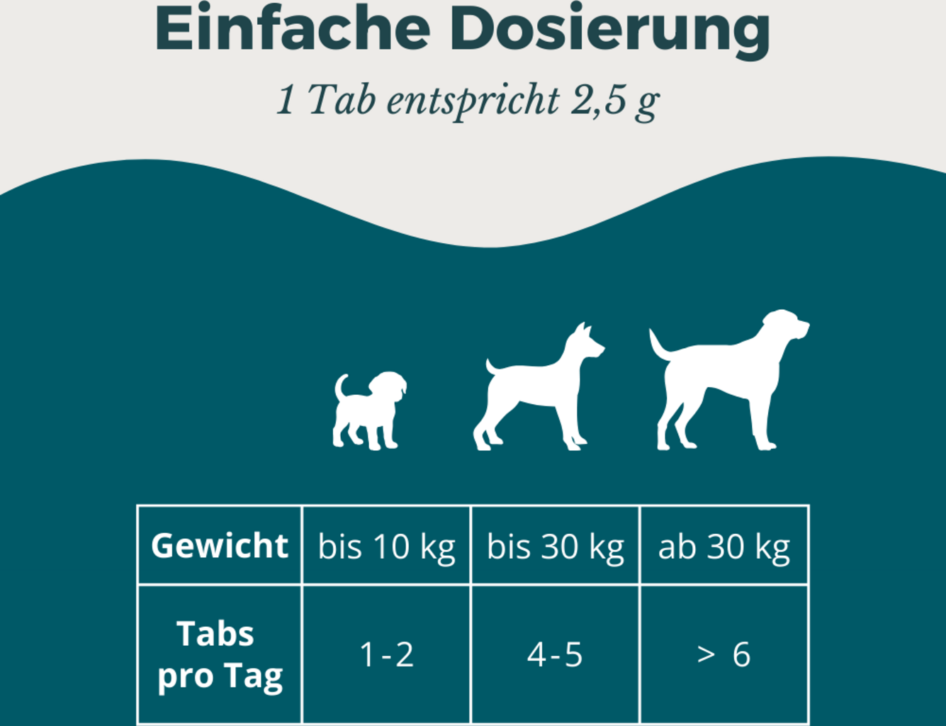 Dosaggio consigliato: le compresse possono essere somministrate da sole o con una piccola quantità di cibo, preferibilmente a stomaco vuoto. La quantità giornaliera può essere divisa in due dosi. Si raccomanda la somministrazione continua quotidiana.