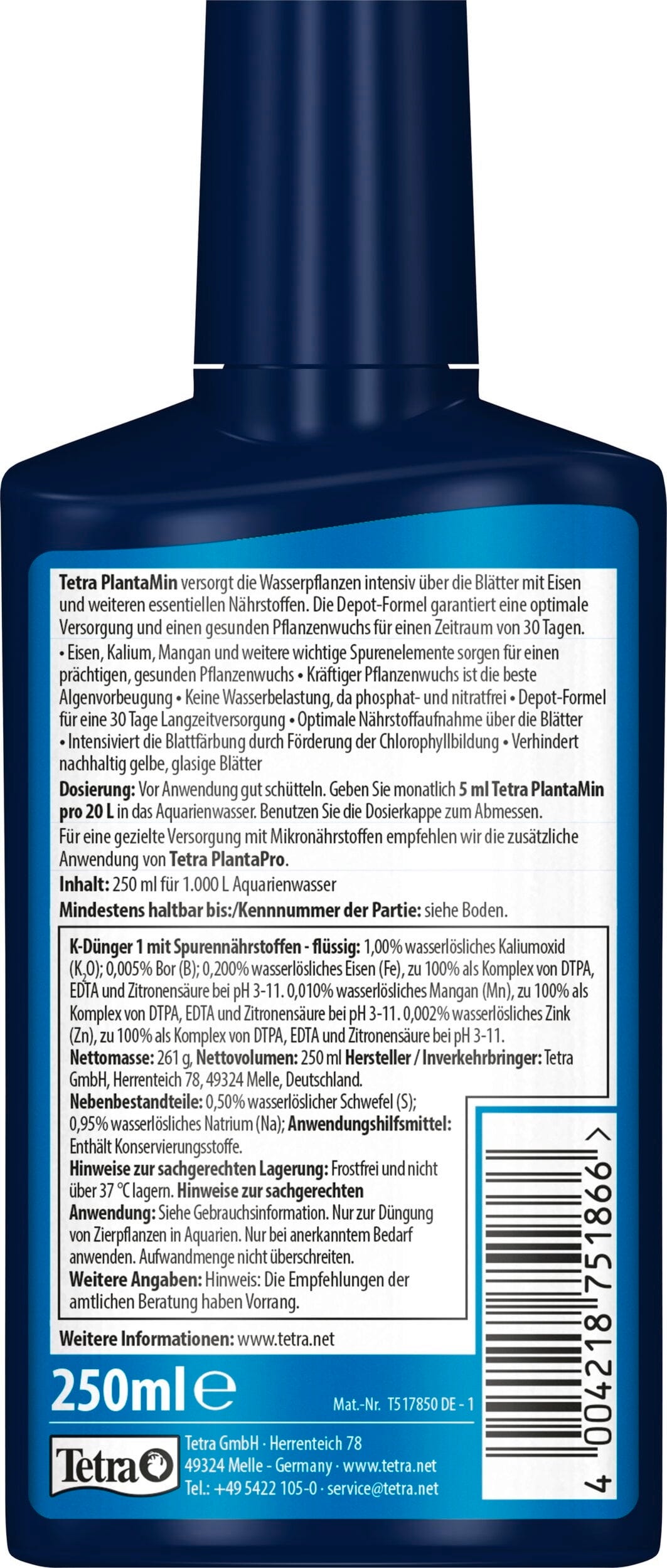 Con PlantaMin di Tetra restituisci vitalità e colori intensi alle tue piante acquatiche, trasformando l'acquario in un paesaggio subacqueo verde e rigoglioso. Questo fertilizzante intensivo a base di ferro è stato sviluppato per prevenire in modo mirato le carenze nutritive e favorire una crescita vigorosa. Grazie alla speciale formula a rilascio prolungato, nutrienti essenziali come ferro, potassio e manganese vengono resi disponibili in modo continuo fino a 30 giorni, garantendo un apporto costante nel tempo.