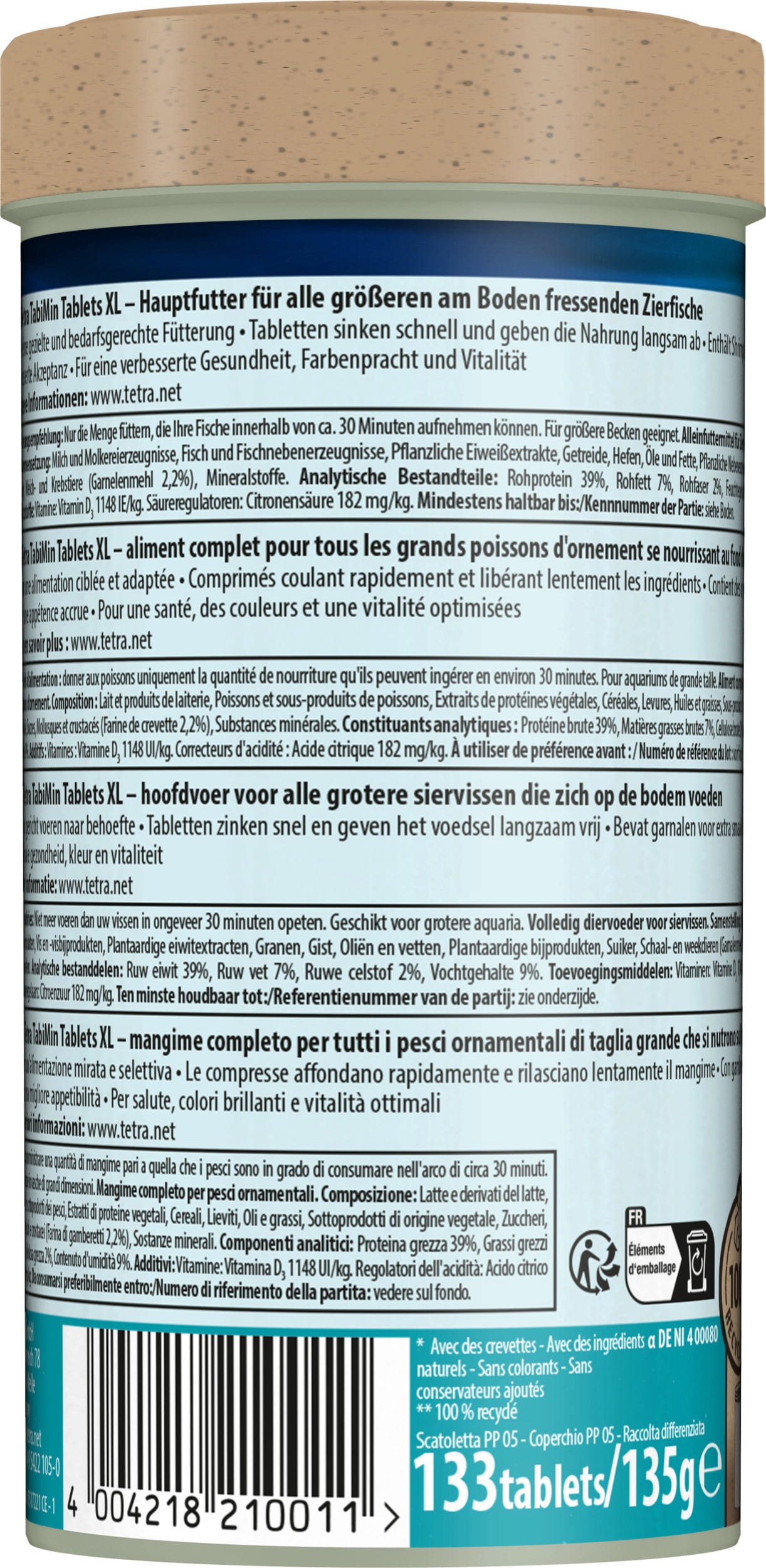 TabiMin Tablets XL è uno speciale mangime completo in compresse adatto a tutti i pesci ornamentali tropicali negli acquari d'acqua dolce che si nutrono sul fondo. Biologicamente equilibrato e ricco di nutrienti, il mangime affonda rapidamente, è facile da posizionare in punti nascosti per i pesci timidi e si dissolve lentamente senza intorbidire l'acqua. La nuova formula Multi-Tablet contiene i gamberetti per migliorare l'accettazione da parte dei pesci, nonché tutti i nutrienti essenziali, le vitamine e i minerali. Le alghe e i carotenoidi contribuiscono all'intensificazione naturale del colore dei pesci. Il mangime inoltre è facile da digerire.