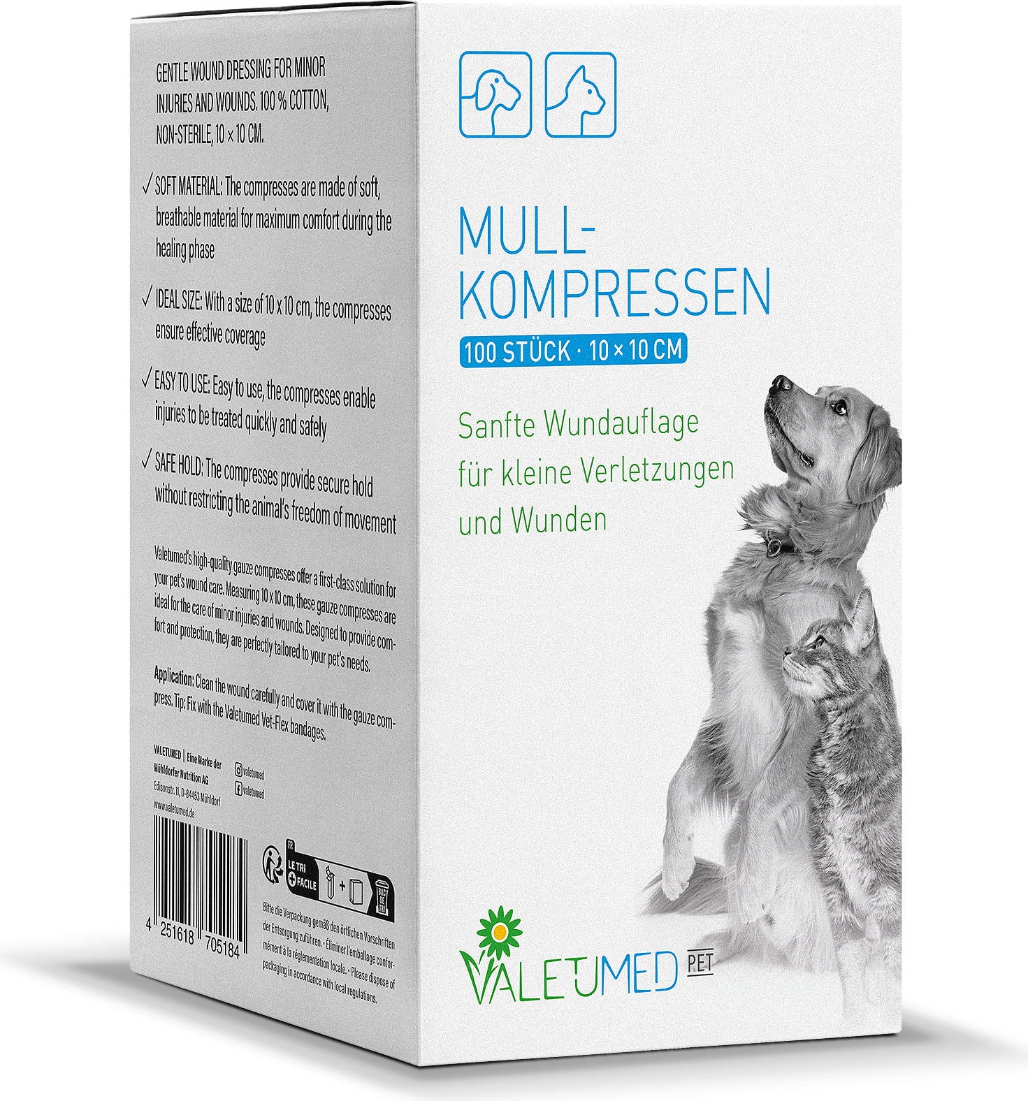 Le compresse di alta qualità di Valetumed offrono una soluzione eccellente per il primo soccorso e il trattamento delle ferite del tuo animale domestico. Con una dimensione ottimale di 10 x 10 cm, le garze non sterili in 100% cotone sono ideali per la cura e la copertura sicura di piccole ferite in cani e gatti.