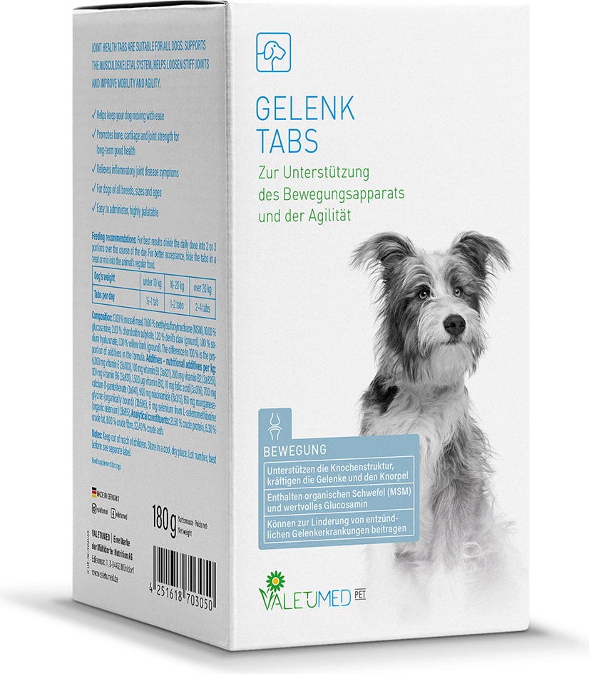 Le compresse per le articolazioni di Valetumed offrono al tuo cane una combinazione mirata di nutrienti per il supporto quotidiano. Soprattutto nei cani di taglia grande, che spesso crescono molto rapidamente, o negli animali il cui apparato scheletrico è maggiormente sollecitato dallo sport o da un peso corporeo più elevato, è importante garantire un apporto ottimale per l’apparato locomotore.