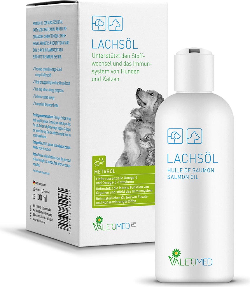 L’olio di salmone di Valetumed è un integratore alimentare collaudato per cani e gatti. Fornisce un’elevata quantità di acidi grassi essenziali omega-3 e omega-6. Poiché l’organismo animale non è in grado di produrre completamente questi specifici acidi grassi, l’integrazione tramite l’alimentazione quotidiana rappresenta un arricchimento utile della dieta.