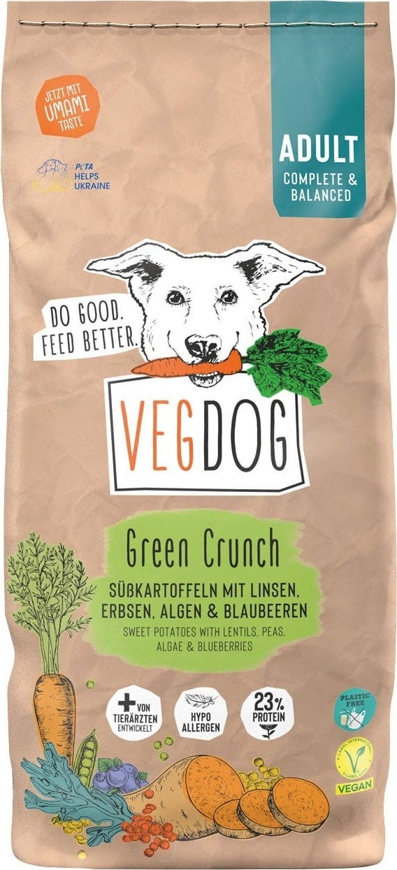 Il cibo secco vegano Green Crunch utilizza una fonte proteica vegetale da lenticchie e piselli invece di una fonte proteica animale. La ricetta preziosa e allo stesso tempo gustosa è raffinata con deliziose alghe ricche di acidi grassi omega-3 e omega-6, nonché patate dolci, zucca, carote, mirtilli e la speciale miscela minerale VEGDOG. Il mangime, accuratamente prodotto in Germania, non utilizza attrattivi, coloranti o conservanti.