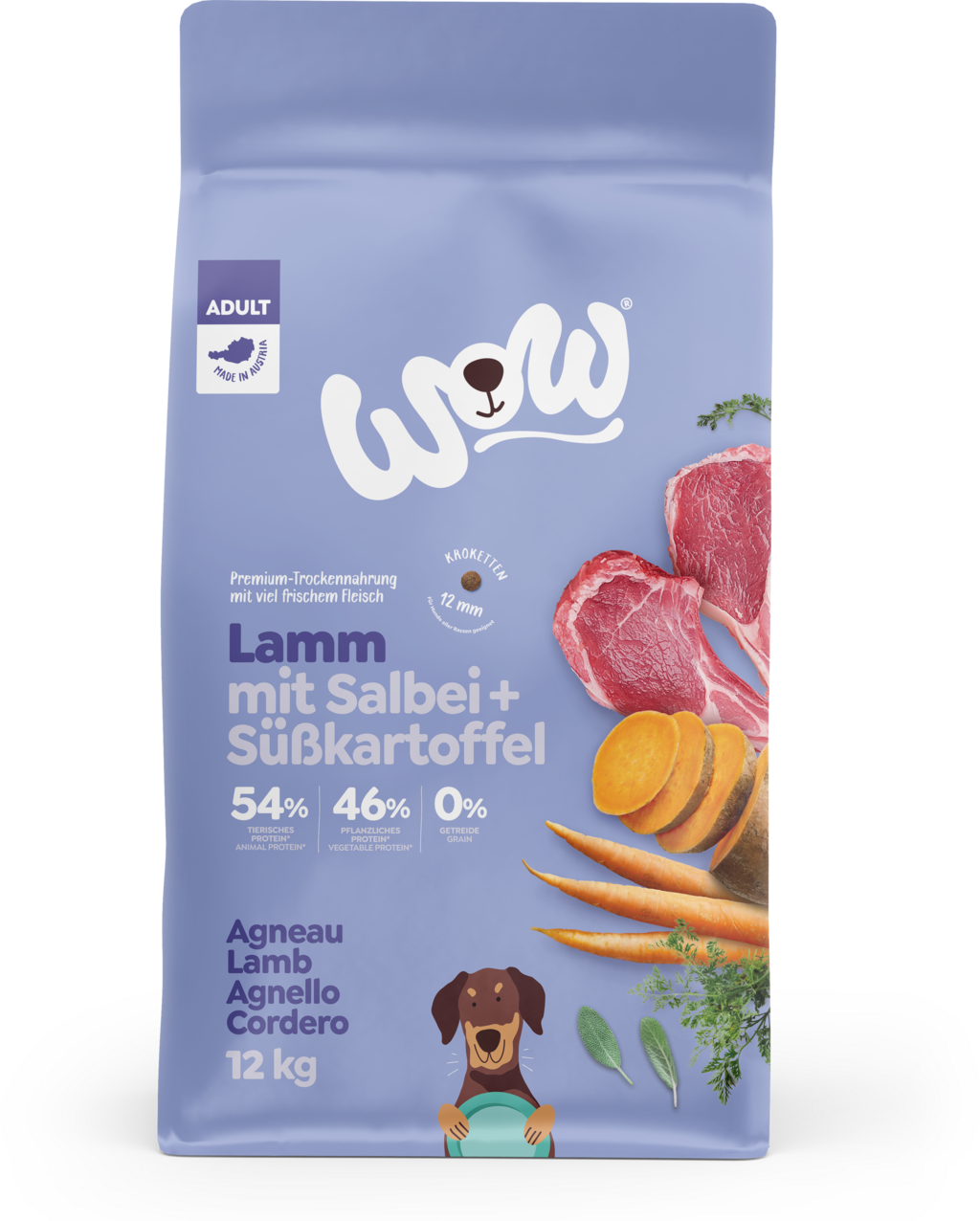 ADULT - Crocchette, Agnello di WOW sono arricchite con salvia e patate dolci e possono essere somministrate a tutti i cani adulti. Non contiene zuccheri aggiunti né esaltatori di sapidità, ma è arricchito con verdure fresche, erbe preziose e minerali.